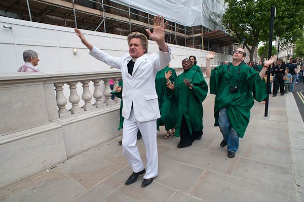 Reverend Billy and the Life After Shopping choir perfrom on the pavement outside Downing St - where police allow no protests