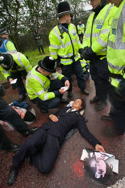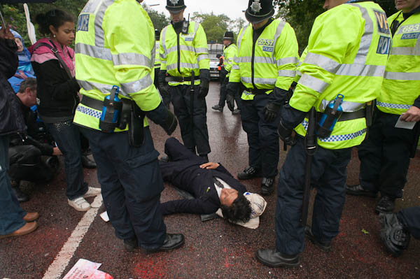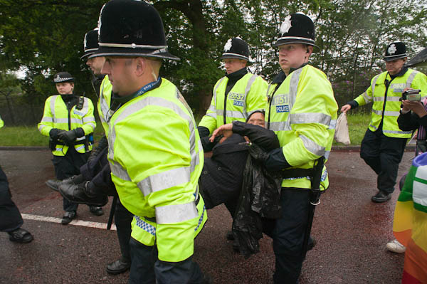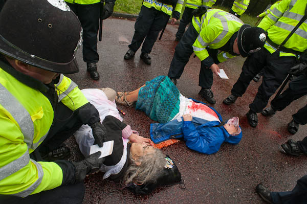and I could only photograph from the verge. A few minutes after the road was cleared the protesters - apart from the six arrested - were allowed to march down the road back to the station, where I found my bike and cycled home through the rain.