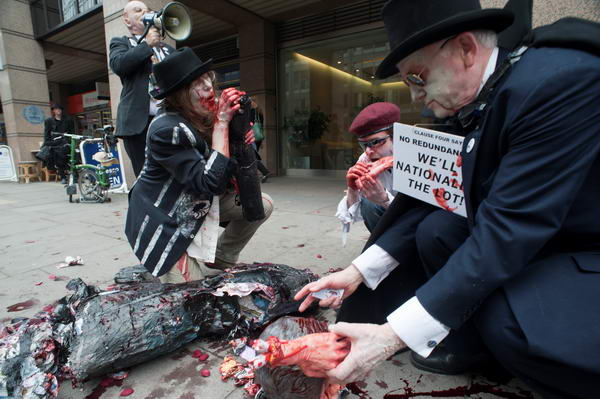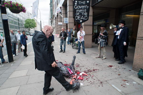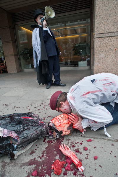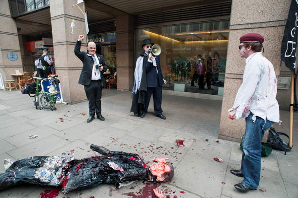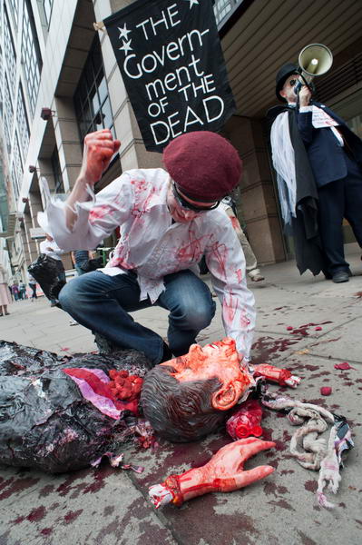 A raised fist salute from Comrade Lenin over the bloody corpse of Brown