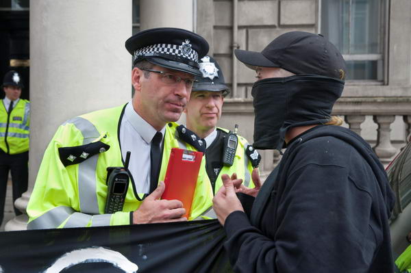 ![]() Police officer in charge talks to a demonstrator |