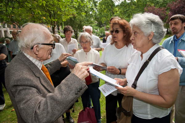 A second socialist choir, Raised Voices also performed, and were followed by Pat Allen of Highbury and Islington CND talking on the the international campaign for a ban on atomic weapons he was involved with in the years before the foundation of CND. and Ann Garrett of Bromley CND reading three of her poems. It was a surprise to also hear a 14-year-old girl, Sonia Azad speak so confidently. I had met her a few months earlier when I was photographing and she was videoing CND's 'Wedding 'Die-In' Against Afghanistan War' at the British military HQ at Northwood in May. The two socialist choirs then joined together for a further anti-bomb song, 'Against the Atomic Bomb' which puts words by Ewan McColl to a Japanese melody.