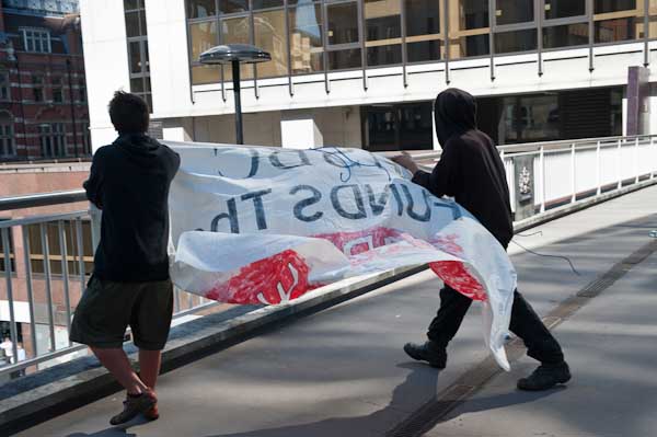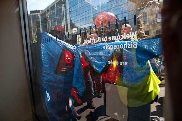 ![]() A banner against HSBC on the bridge looking down on Barclays |
