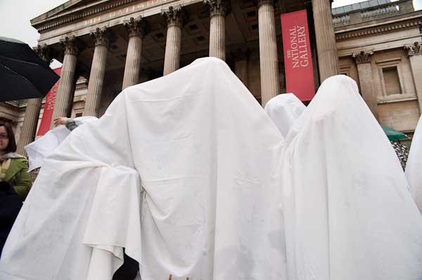 The Bhopal Medical Appeal held a memorial service to mark the 25th anniversary of the Bhopal disaster and remember the many thousands who have died at the time and since. Deaths continue as Union Carbide (now owned by Dow Chemical) have refused to clean up the pollution, which also causes horrific birth defects. Some of those attending had brought white sheets representing funeral shrouds, and wrapped themselves in these.