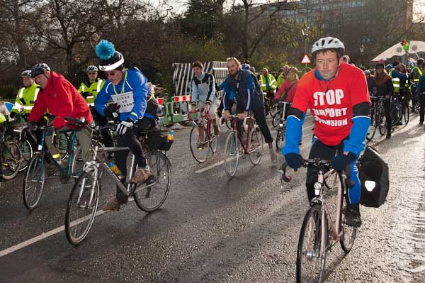 Over 200 cyclists, along with a unicyclist and a skateboarder gathered at Lincolns Inn Fields at 10am on Saturday for a urge the government to make major emissions cuts at the UN climate talks in Copenhagen. The Climate Emergency bike ride was organised by the Campaign against Climate Change, who have been organising major demonstrations over climate change since 2001 when they held a rally in London against the US rejection of the Kyoto Climage treaty. Every year since 2005 they have organised a National Climate March to put pressure on the government at the time of the annual UN climate talks, and the bike ride was a part of this year's event.