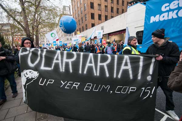 COP15 is the official name of the Copenhagen climate change summit, and for a minute or two this banner led the march as it came through Berkeley Square while march stewards came and argued with them. After a short while and the intevention of a rather stout cop these protesters were persuaded to roll up their banner and suggested they join the march rather further back.