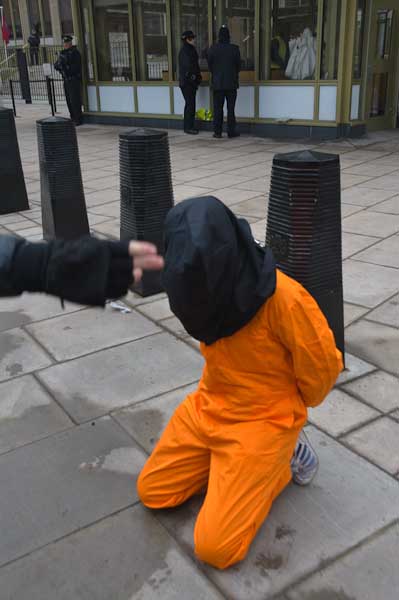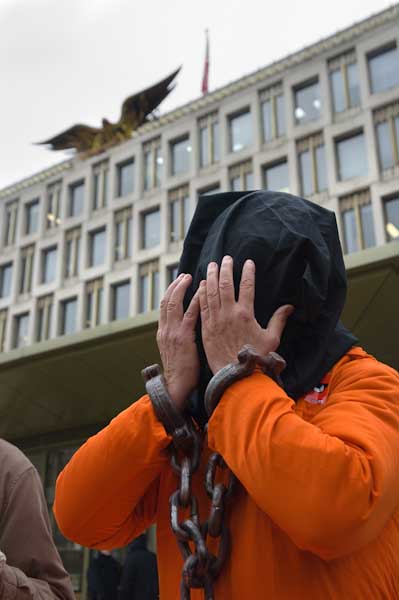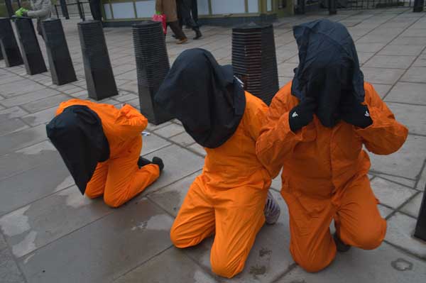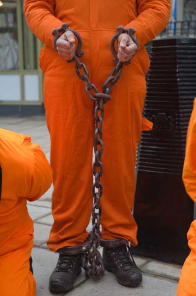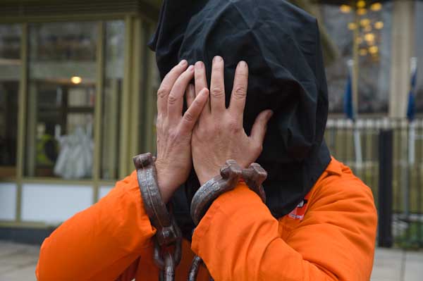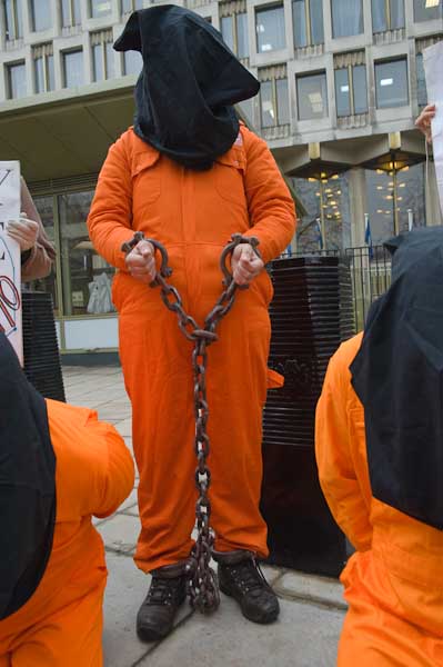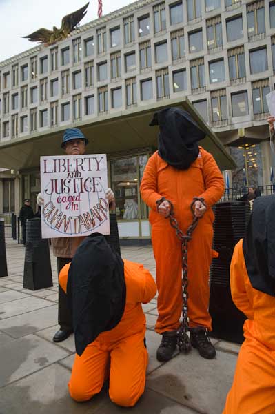 Black hoods and orange jumpsuits in Guantanamo vigil at US Embassy