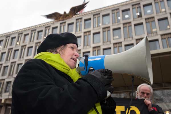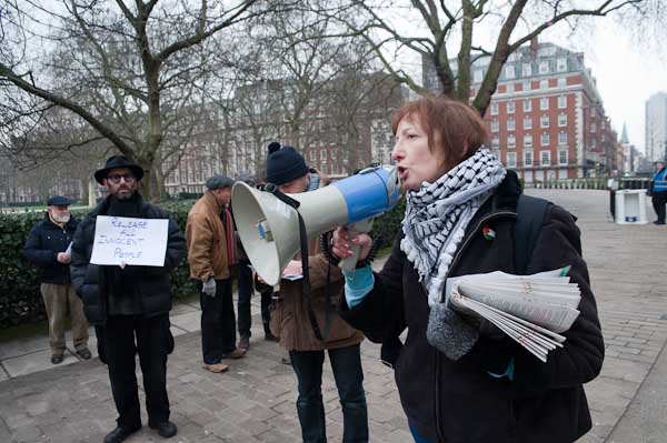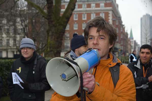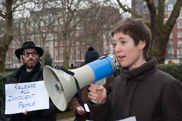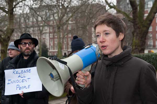![]() Chloe Davies of Reprieve and an appopriate placard on the end of her megaphone |
