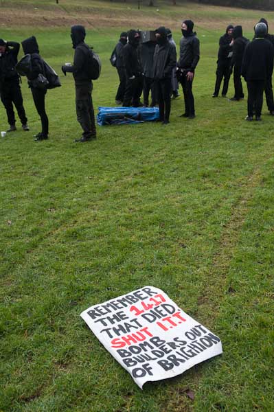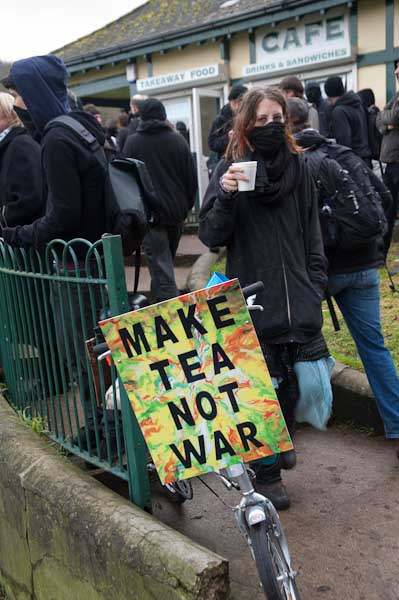 'Remember the 1417 that died. Shut I.T.T Bomb Builders of of Brighton' and 'Make Tea Not War'