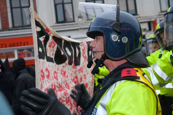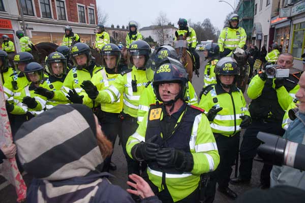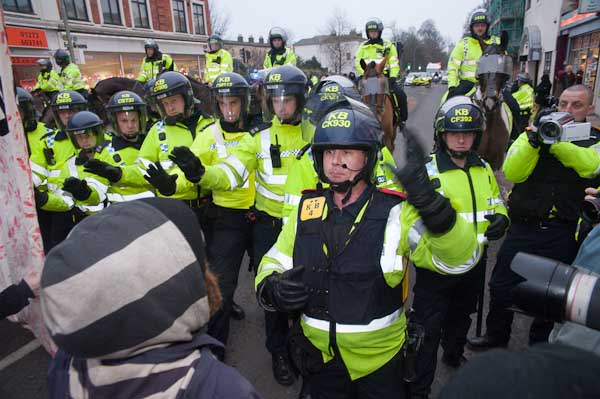 Eventually the police line retreated, but then broke down where the road widened and poeple flooded through