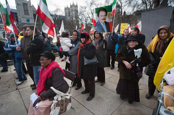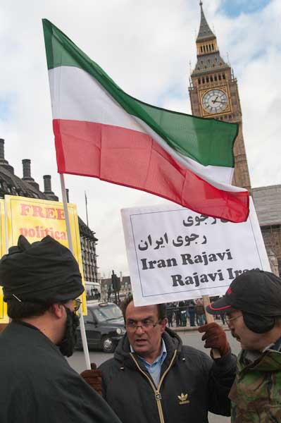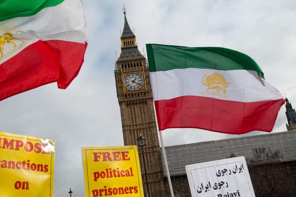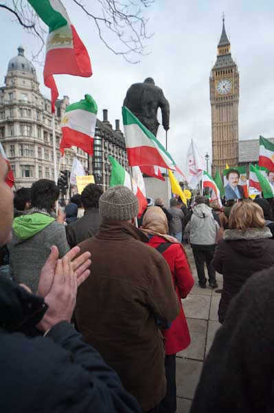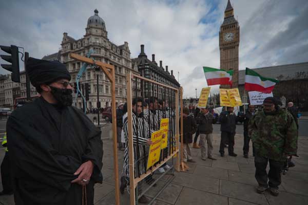 A small tableaux representing the repression in Iran in front of Big Ben at the front of a large crowd of protesters