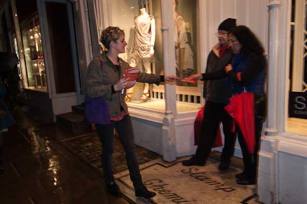 Tamsin hands a leaflet to a couple sheltering from the rain