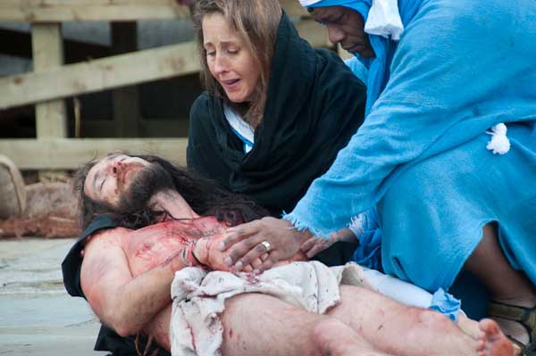 The play followed fairly closely the traditional story as related in the four gospels, adding a certain amount of spectacle. Although the flogging of Jesus occured off-stage and the sound effects were rather unconvincing, the crucifixion that followed was a pretty gory sight.