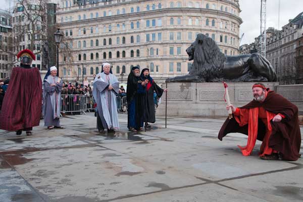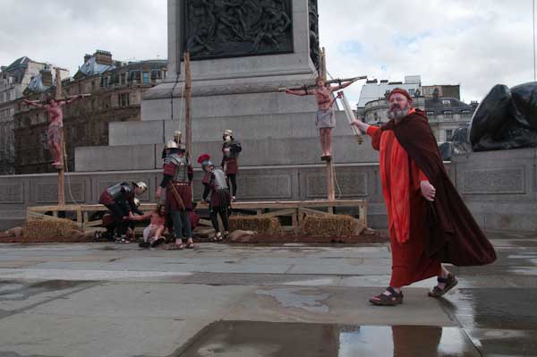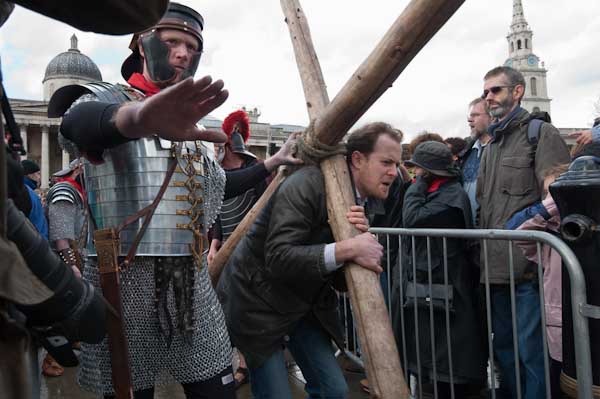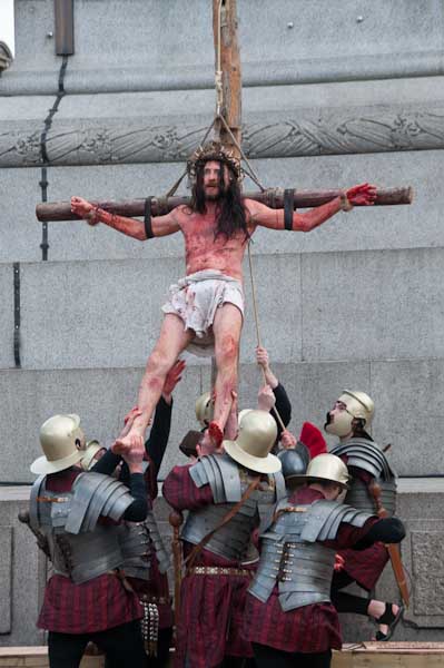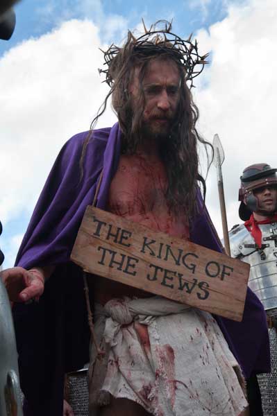 Jesus is brought to be crucified wearing a crown of thorns and a board 'The King of the Jews'