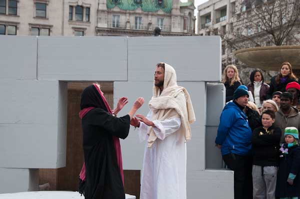 But finds to tomb empty, and is distraught, thinking the body has been stolen