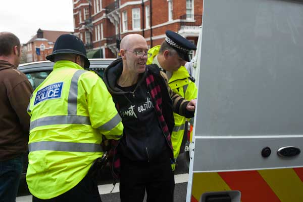 and the man, still protesting his innocence, is pushed inside