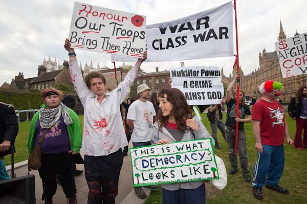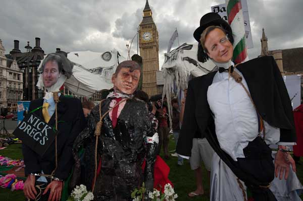 Protesters against Parliament and the political parties converged on Parliament Square on May Day afternoon to execute effigies of George Brown, David Cameron, Nick Clegg and Nick Griffin and hold a May Day Party.
