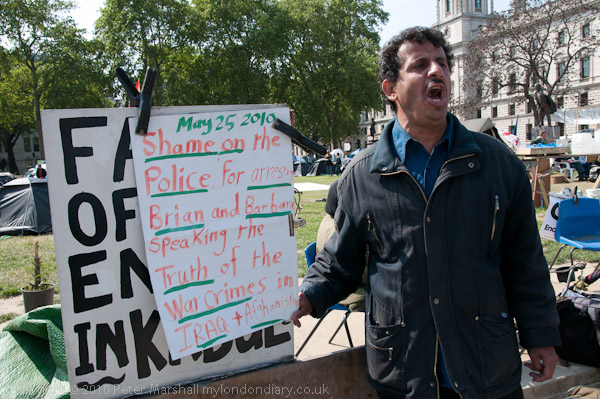Brian Haw too was continuing his campaign, and gave a spirited rendering of the poem 'Kabullshit', written this February, one of a number of war related poems from the Freedomlite site.