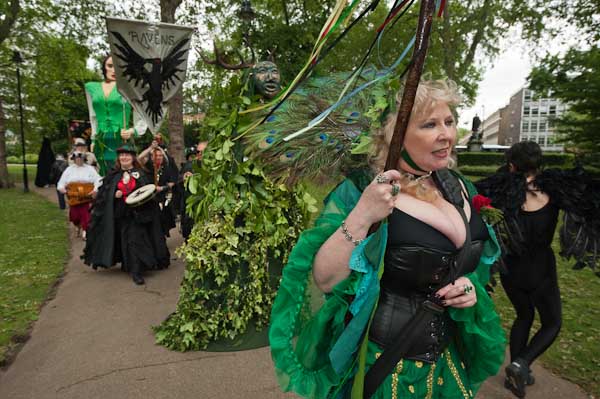 The parade gathered on Sunday morning in Red Lion Square, with the Pentacle drummers and several 'giants' including the Morrighan - a Celtic War goddess, accompanied by ravens. Leading the march was organiser Jeanette Ellis, a traditional witch and writer and lecturer on witchcraft (she also makes pagan jewellery) from Walthamstow carrying the stang, a pole decorated with coloured streamers, antlers and on its tip a model stag, and behind her were the Jack in the Green and banners.