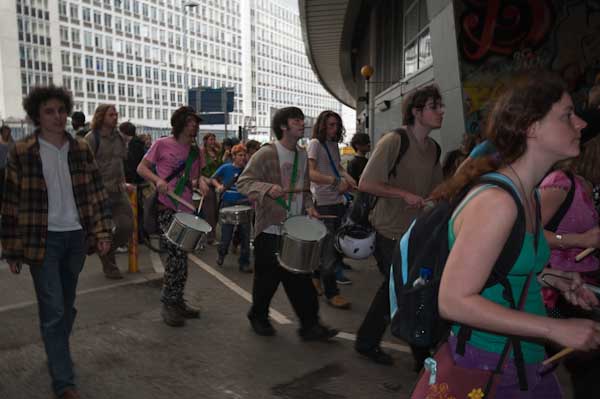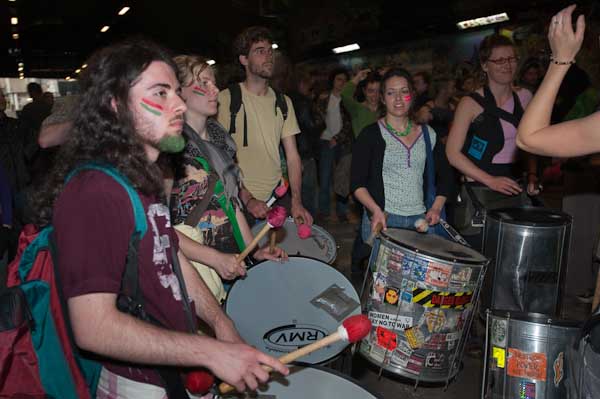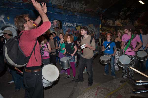 Rhythms of Resistance marched across Waterloo Bridge and into Leake St where I caught up with them