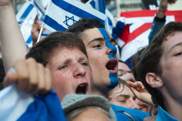 One young man in the crowd with blue paint on his face, the colour of the Israeli flag