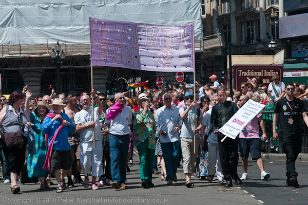 The Gay Liberation Front banner leads the march. Peter Tatchell carries an Outrage placard calling for an