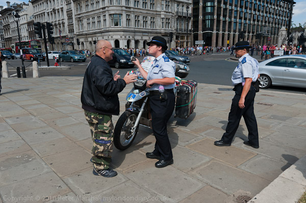 Sixty-nine year old Vladimir A Yarets from Minsk in Belarus greets PCSOs in Parliament Square
