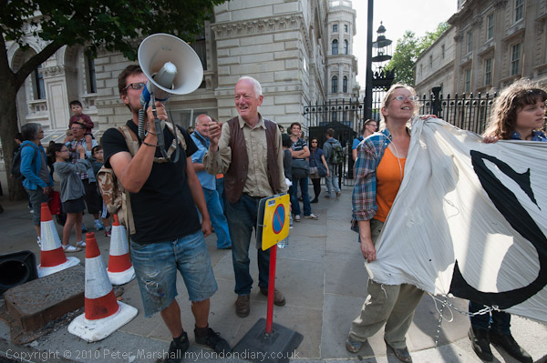 ![]() The Stop the War demo was continuing opposite Downing St, though attendance was rather low ![]() The Democracy Camp came with their banner and stood in front of the Downing St gates ![]() ![]() ![]() They called for the others to come and join them outside Downing St - where protest is prohibited ![]() ![]() ![]() |