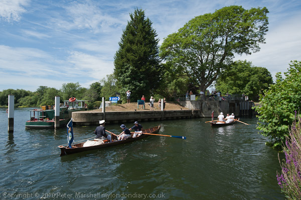![]() ![]() Entering Penton Hook Lock ![]() ![]() ![]() The Queen's Swan Marker, David Barber ![]() Swans race one of the boats, but the uppers ignore them as they have no cygnets ![]() |