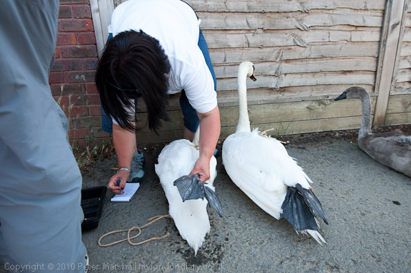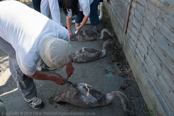 ![]() for ringing, weighing, measuring, a quick health check and recording ![]() A pair of neatly trussed swans ![]() The adults ring numbers are read and recorded ![]() ![]() ![]() ![]() ![]() ![]() and the swans are returned |