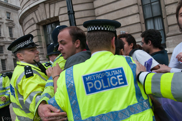 A police officer holds back one of the protesters, but there was no real attempt to break through the police line