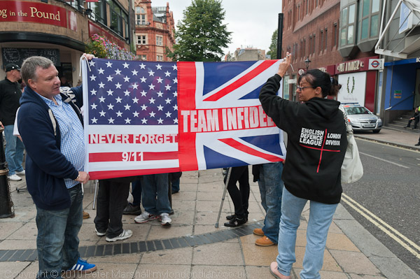The US Stars and Stripes combined with the Union Jack by 'Team Infidels' with the message 'Never Forget 9/11'