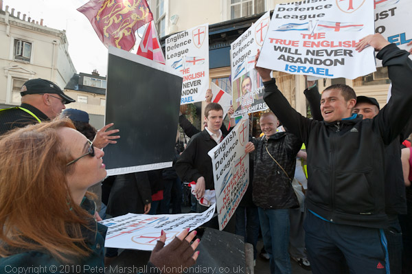 are handed out to EDL protesters outside the Gloucester Arms pubSeveral hundred EDL members marched to the the Israeli Embassy in London and held a peaceful rally in support of Israel with Rabbi Nachum Shifren, a 'tea party' California State Senate candidate as guest speaker.
