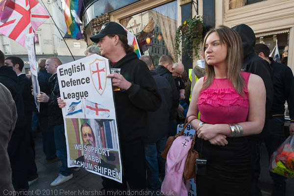 Rabbi Nachum Shifren talks with EDL members outside the pub in Gloucester Rd