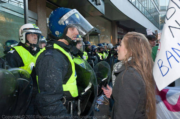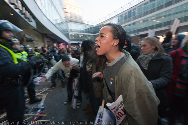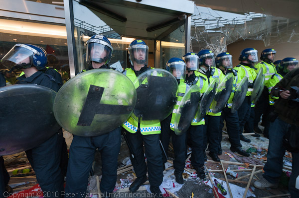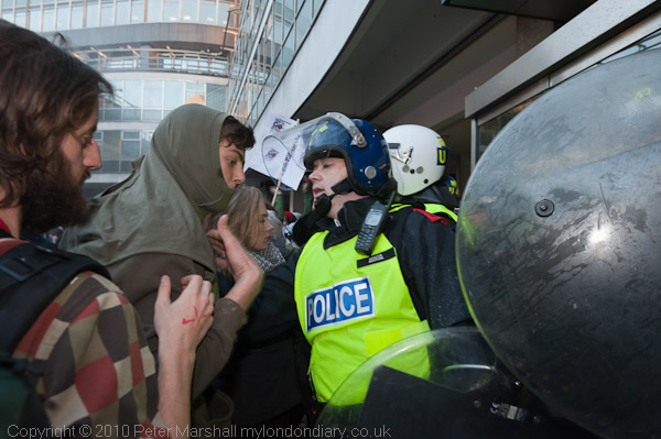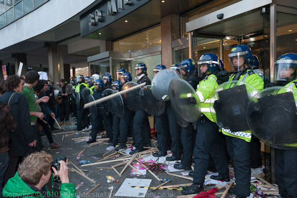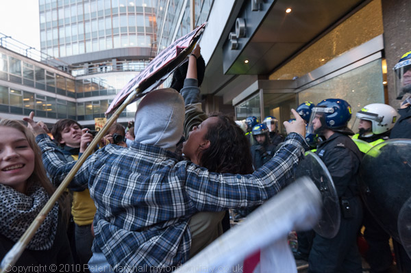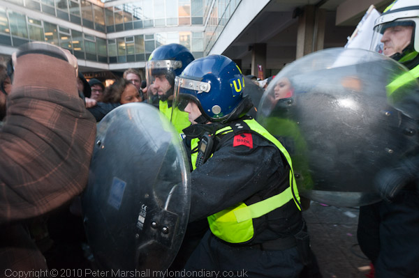 a stick from a placard is thrown towards the police - it bounces off the raised riot shield
