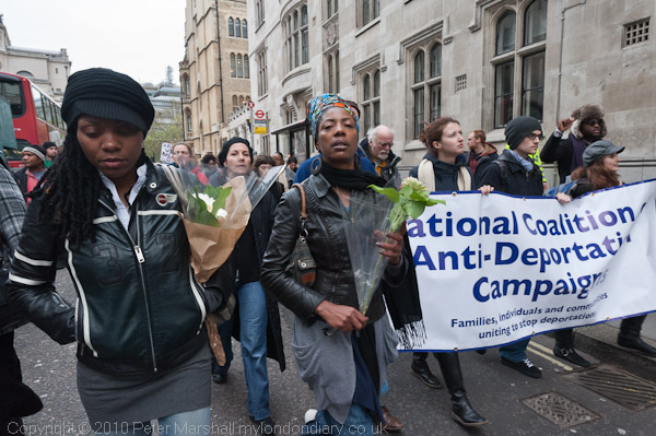 A woman holds up a flyer about Jimmy Mubenga, killed exactly a month ago on a plane at Heathrow