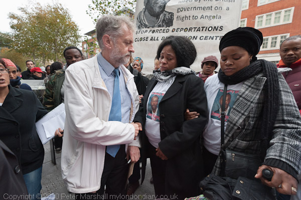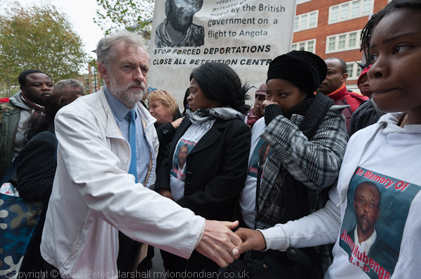 Jeremy Corbyn shakes hands with Makenda Kambana and other members of Jimmy Mubenga's family