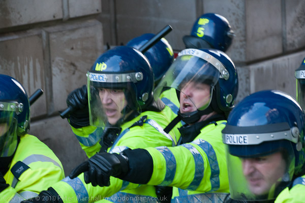 Outside the kettle, riot police were charging more demonstrators and pushing them backaway from the protest