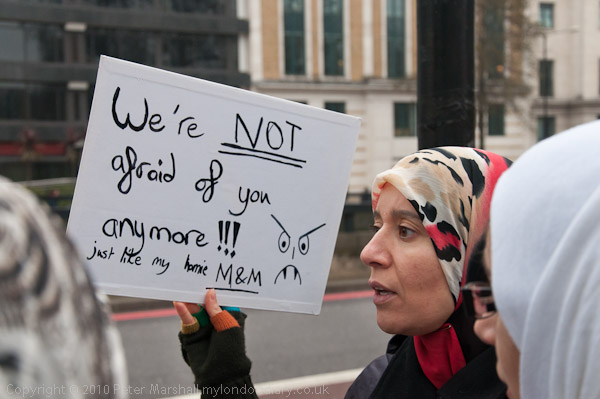 One holds a sign that says 'We're NOT afraid of you anymore!!!'