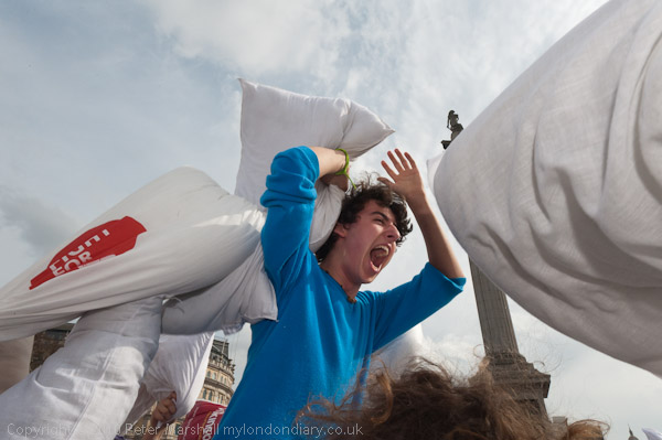 part in a pillow fight in Trafalgar SquareSeveral hundred people took part in a half hour pillow fight in Trafalgar Square, part of the urban playground movement and one of 150 pillow fights in cities around the world today in some kind of world record attempt.