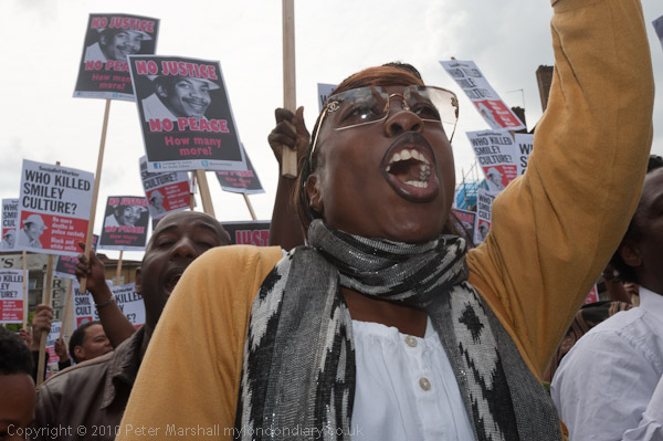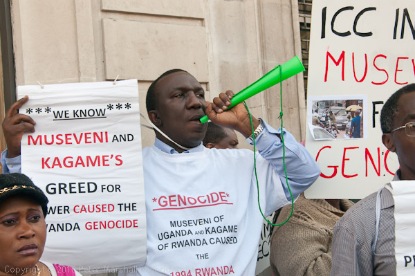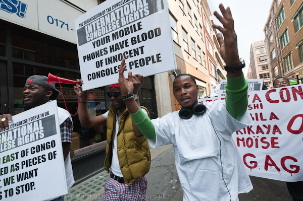 The International Congolese Rights organisation marched from the Congolese Embassy in Great Portland Street to Downing St calling attention to human rights violation in the DRC and asking the UK Government to put pressure on President Kabila to hold elections or resign. London,UK 23/04/2011