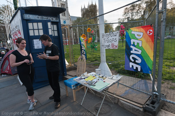 The resident protesters including Brian Haw's Peace Campaign and the Peace Strike are still in Parliament Square, enjoying the extra attention from crowds coming for tomorrow's royal wedding.