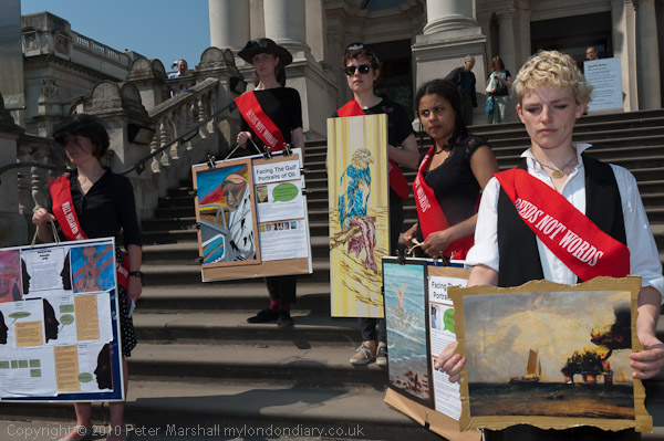 The meeting point on the promenade near the ruins of the West pier was a closely guarded secret, posted on Twitter, Facebook and on a mobile number half an hour before the event was to start. When I arrived there were around a dozen photographers and a couple of plain clothes police standing and watching roughly the same number of protesters, with a couple of police on horses around 50 yards along the prom and several police vehicles waiting on the road opposite.