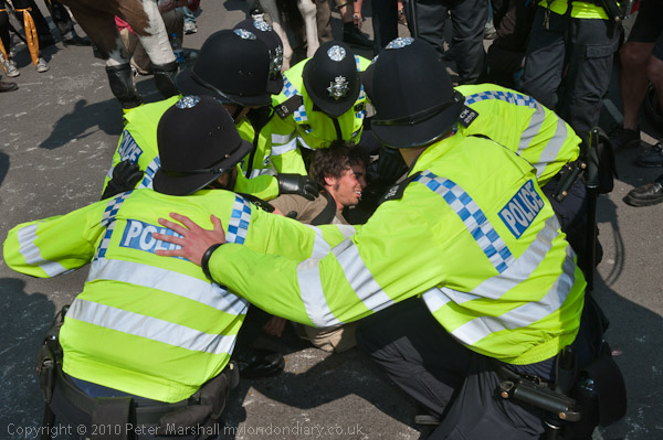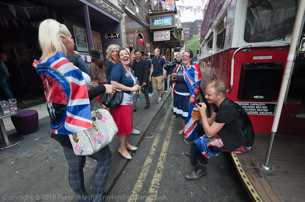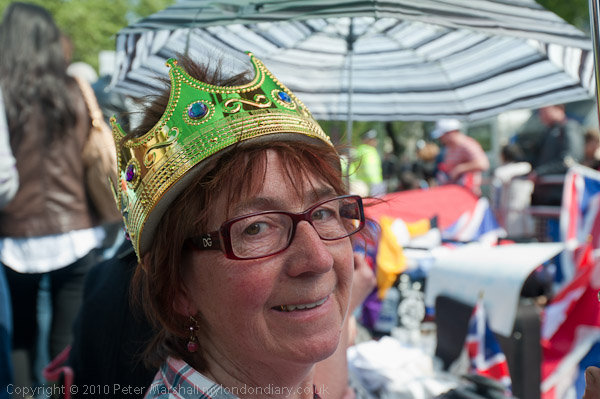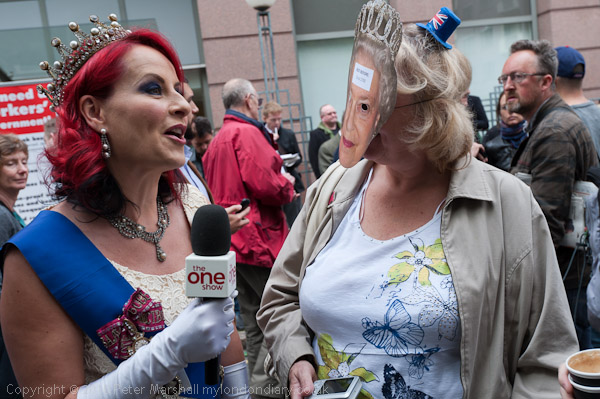 There was a woman with a mask with the Queen's face, a BBC TV presenter dressed as a royal (I think it was Alex Jones and hope it was just a bad wig), lots of TV cameras, Peter Tatchell, and a few rather lost-looking members of the 'Love Police' whose leader had previously been taken into custody. Police had also prevented what would have been some amusing street theatre by arresting Chris Knight and a couple of his friends and confiscating their props including a small and not too convincing guillotine and some royal effigies.