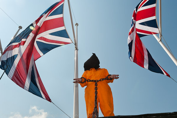 Maria Gallastegui was standing on top of her police box, wearing orange Guantanamo fatigues and a black hood, a reminder that their is still one Londoner, Shaker Aamer, a Muslim relief worker whose family are still living in Battersea, imprisoned in Guantanamo Bay, and that another man who spent his teenage years in Britain, Bradley Manning, is also in military detention in the US, accused as the Wikileaks whistle-blower.