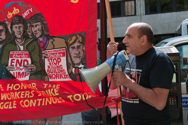 The protest was organised by the Construction Safety Campaign, which had also organised a wreath-laying at the statue of the unknown worker at Tower Hill earlier in the day. The construction industry is one of the most hazardous to workers, and deaths last year are thought to be up by 15%. Tony O'Brien, National Secretary of the Construction Safety Campaign, was in charge of the rally and was speaking when I arrived.