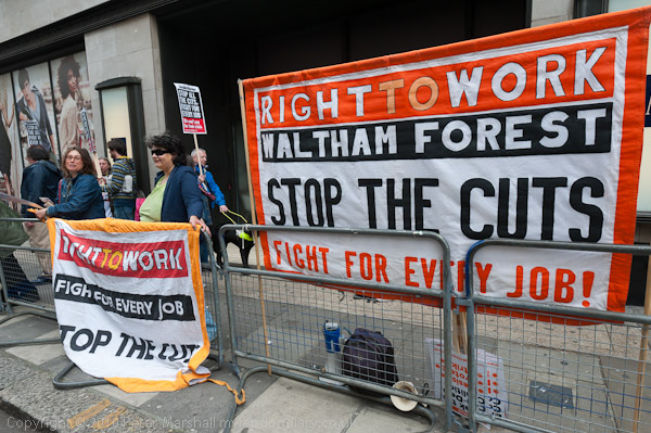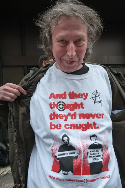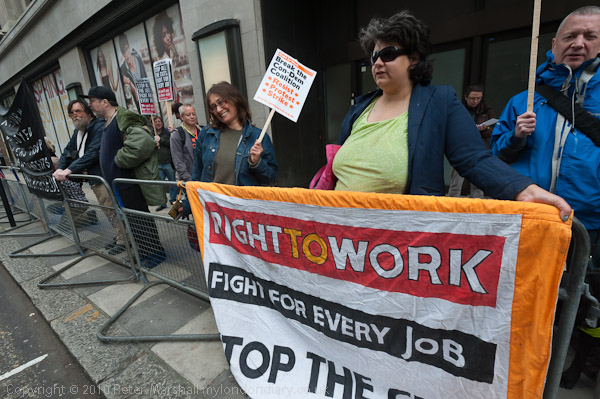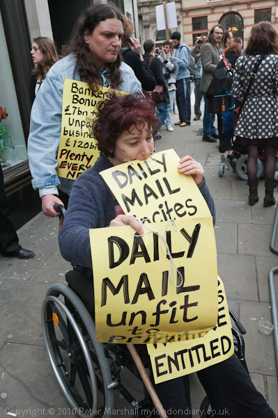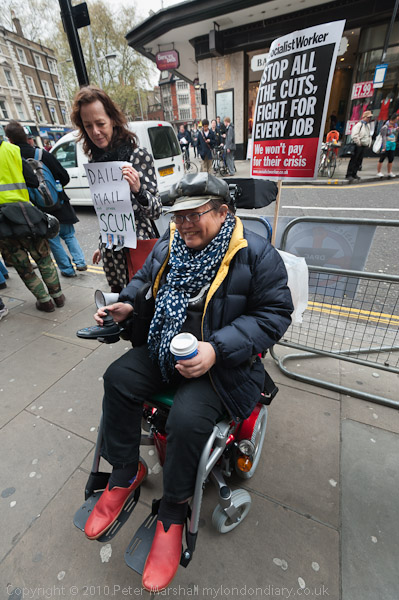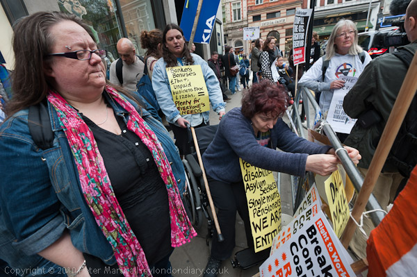 Several of the activists were in wheelchairs, and 'Disabled People Against Cuts' was one of the groups orqanising the event