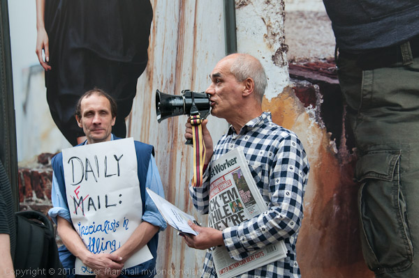 Protesters set up banners opposite Northcliffe House, the Daily Mail Offices just off Kensington High St