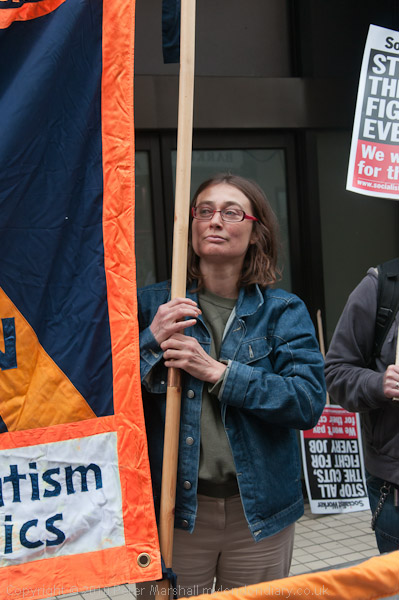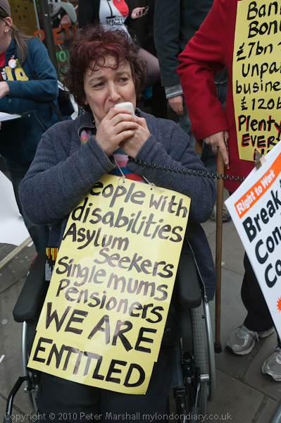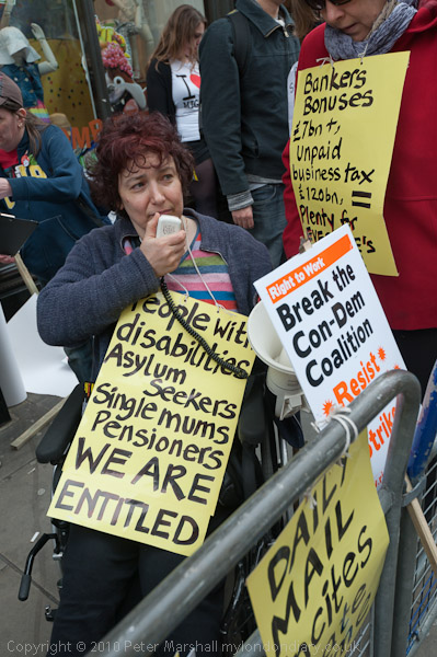 Autistic Rights Movement London and RIght to Work banners along with Socialist workers placards against the cuts