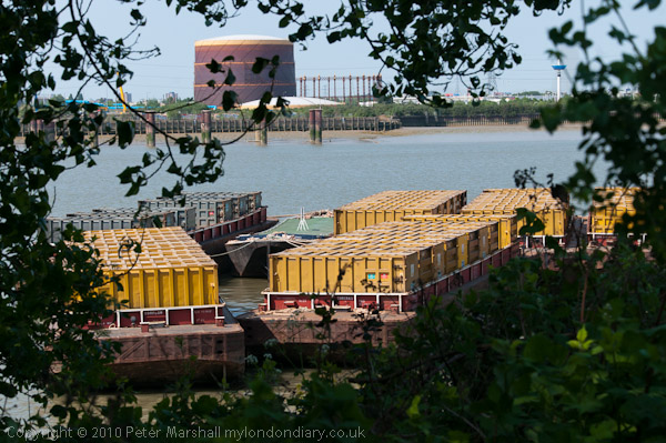 There are glimpses of the river and these waste transfer barges though trees and over bushes
