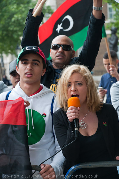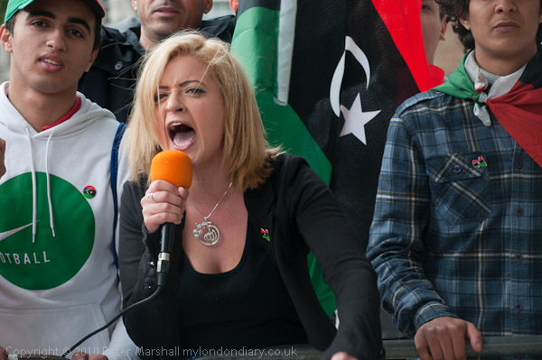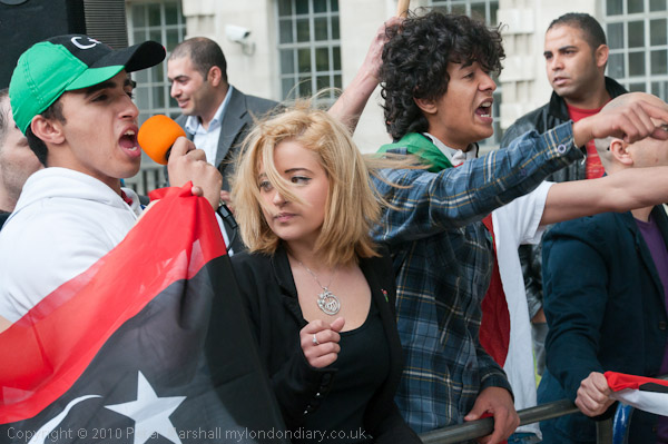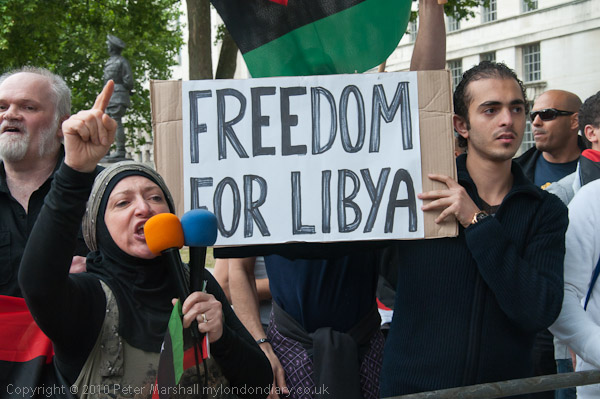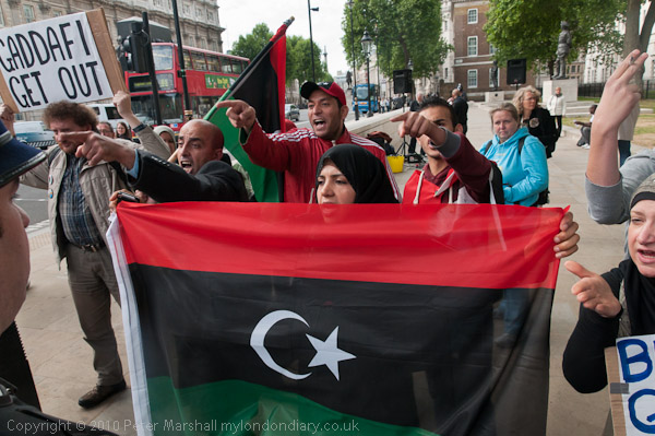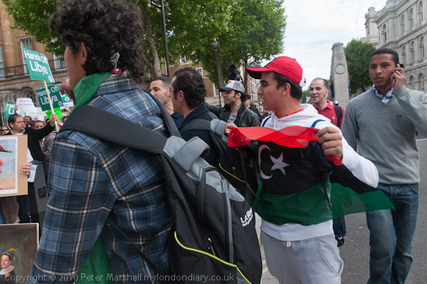 Another small group of Libyan opposition supporters arrives and walks past the Stop the War demo